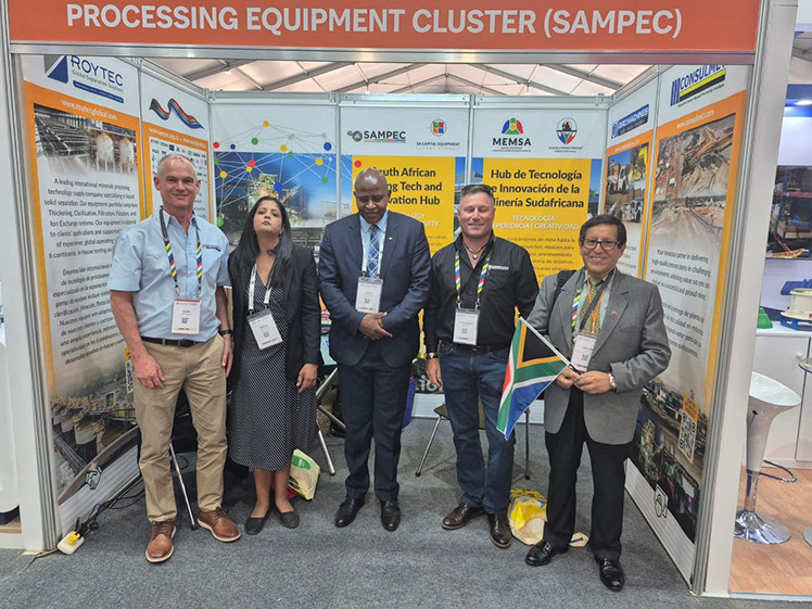 Módulo sudafricano en la Convención Minera PERUMIN 37. En la foto, de izquierda a derecha: Alwyn Van Biljon (Bird Machines (Pty) Ltd), Kerosha Ramjettan (Primera Secretaria de la Embajada de Sudáfrica en Chile), George Monyemangene (Embajador de Sudáfrica en Chile), Justin Macnab (Cónsul) y Juan José Quiroga Coronel (Capítulo de Ingeniería Minera de la Asociación de Ingenieros Profesionales del Perú y miembro de la Junta Directiva de SAPCHAM).