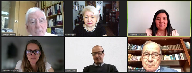 (de izquierda a derecha) Santiago Montt, presidente de la Cámara Chilena-Sudafricana de Industria, Comercio y Turismo (CCHISA); Itala Piaggio, Gerente General de la Cámara de Comercio Peruano-Sudafricana (SAPCHAM); Alexandra Mosquera, directora ejecutiva de la Cámara de Comercio e Integración Ecuatoriano-Peruana (CAMEPE); Carolina Echenique, delegada de la Cámara Chilena-Sudafricana de Industria, Comercio y Turismo (CCHISA), Xavier Granja, presidente de la Cámara de Comercio e Integración Ecuatoriano-Peruana (CAMEPE) y Guillermo van Oordt, presidente de la Cámara de Comercio Peruano-Sudafricana (SAPCHAM) durante la oficialización del convenio de cooperación interinstitucional. (08 FEB 2022)
