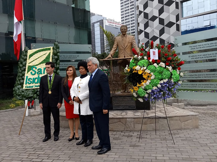 Ceremonia por el Centenario del Natalicio de Nelson Mandela (de izquierda a derecha: Javier Bedoya Denegri, Teniente Alcalde y Alcalde en funciones de San Isidro; Gladys Andrade, Presidenta de la Liga Parlamentaria de Amistad Perú-Sudáfrica, Congreso de la República; Rachel Nomonde Rasmeni, Embajadora de Sudáfrica y Embajador Gustavo Otero, Director General de Africa, Medio Oriente y Países del Golfo, Ministerio de Relaciones Exteriores). Monumento en Honor a Nelson Mandela, Parque Andrés Avelino Cáceres - Setiembre 20, 2018