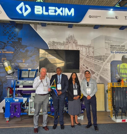 Módulo sudafricano en la Convención Minera PERUMIN 37. En la foto, de izquierda a derecha: Alwyn Van Biljon (Bird Machines (Pty) Ltd), Kerosha Ramjettan (Primera Secretaria de la Embajada de Sudáfrica en Chile), George Monyemangene (Embajador de Sudáfrica en Chile), Justin Macnab (Cónsul) y Juan José Quiroga Coronel (Capítulo de Ingeniería Minera de la Asociación de Ingenieros Profesionales del Perú y miembro de la Junta Directiva de SAPCHAM).