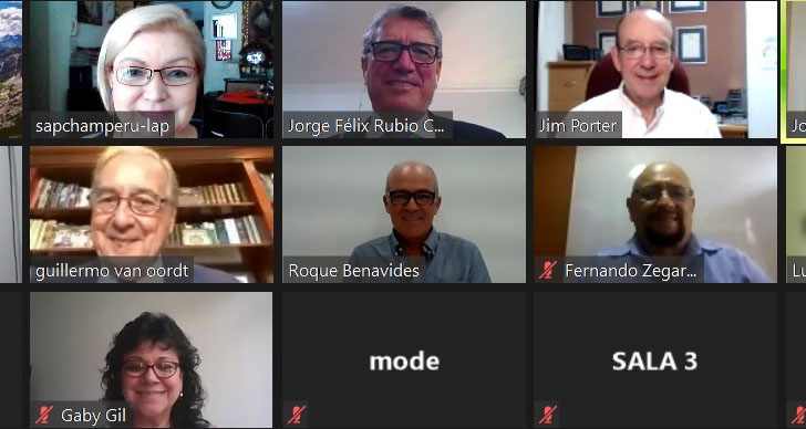 XIII Congreso Nacional de Minería – CONAMIN 2021 organizado por el Colegio de Ingenieros del Perú. Fila superior: Itala Piaggio, Gerente General de SAPCHAM; Embajador Jorge Félix Rubio Correa de la Embajada de Perú en Sudáfrica; Sr. Jim Porter de ING Ingeniería S.A., Josefina Obregón, Coordinadora CONAMIN. Fila central: Valeria Rojas staff CONAMIN, Ing. Guillermo van Oordt, Presidente de SAPCHAM, Sr. Roque Benavides, Presidente Comité Organizador CONAMIN XIII; Ing. Fernando Zegarra, Gerente General de Mineral Fluids Engineering Design & Services S.A.C.; Luisa Portocarrero, intérprete. Fila inferior: Embajadora Rachel N. Rasmeni de la Embajada de Sudáfrica en el Perú y Gaby Gil staff CONAMIN. Marzo 19, 2021.